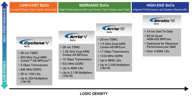Компания Altera предлагает полную линейку Систем-на-Кристалле SoC FPGA, ориентированных на приложения старшего, среднего и младшего классов: